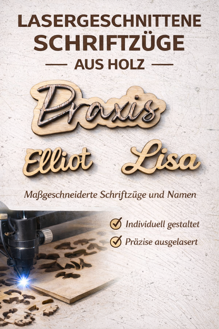 Maßgeschneiderte Schriftzüge aus Holz, präzise gelasert, individuell gefertigt, zeitlos schön.